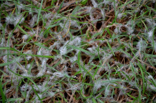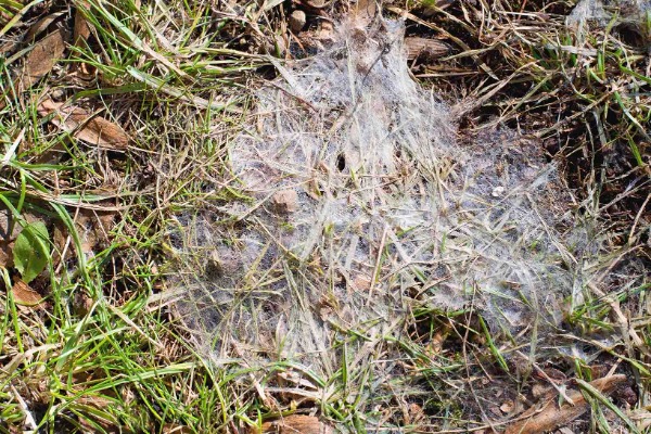 Snow mold becomes visible as snow and ice melt away in late winter or early spring. Instead of a lush green carpet, you may find circles or patches of grass that look grayish-white, straw-colored, or faintly pink. These areas are typically matted down and may feel crusty or damp. When conditions stay moist, you can sometimes see a delicate fuzz or cobweb-like growth coating the blades of grass that’s the fungal mycelium responsible for the disease.